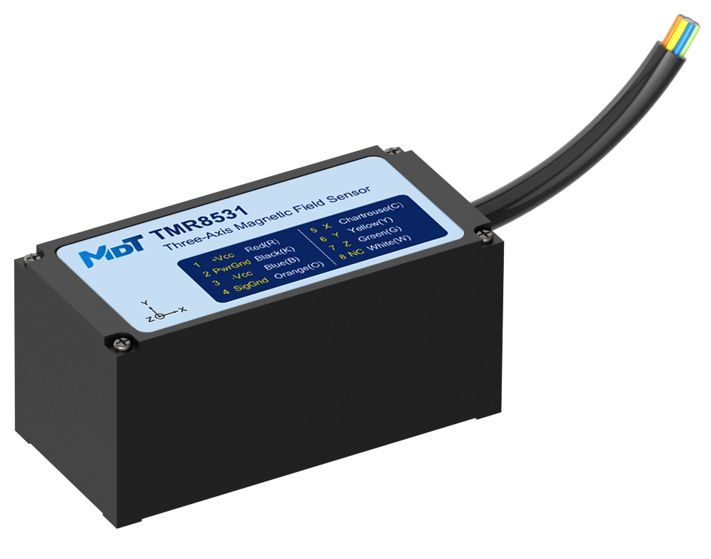 The TMR8501 is a compact and high-precision linear magnetic sensor, featuring low noise and fast response. This sensor is encased in a module-level package measuring 29mm × 18.5mm × 8.6mm. It boasts a measurement range of ±500 μT and supports either single or dual power supply options, with voltage ranges from ±3.3V to ±15V. Operating temperatures range from -40°C to 85°C. Utilizing advanced tunneling magnetoresistance (TMR) technology, the TMR8501 integrates a magnetic field feedback coil and a weak signal conditioning circuit. This configuration allows it to achieve a low noise level of 15 pT/√Hz at 1Hz, linearity of 0.05%, sensitivity temperature drift of 40 PPM, and sensitivity variation of 0.3% across a temperature range of -40°C to 75°C. With a bandwidth of 500 kHz, it enables high-resolution, real-time measurement of weak magnetic fields. The TMR8501 is ideally suited for applications such as environmental magnetic field monitoring, food safety testing, geophysical magnetic detection, traffic monitoring, and magnetic metal detection. | TMR8501 TMR8531 |