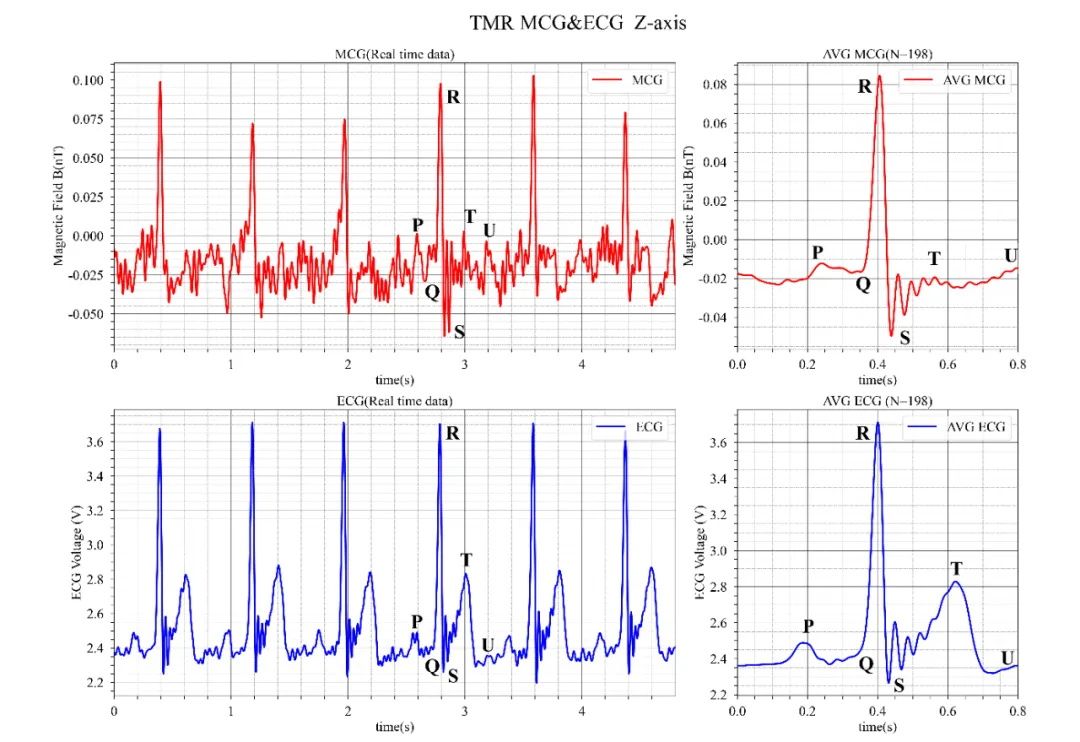2024 年 7 月 1 日消息,专注于隧道磁阻 (TMR) 技术的磁传感器制造商江苏多维科技有限公司的研发人员与宁波大学未来无线研究院智能传感及量子精密测量实验室科研团队,于 2024 年 5~6 月,共同完成了 TMR 传感器心磁信号检测联合测试。在健康成人心磁信号检测实验中,采用公司自研的皮特级 TMR 传感器芯片和心磁心电测试电子系统,在双向开口的磁屏蔽筒当中,在径向 y/z 两个方向均成功检测到了志愿者仰卧位高质量实时心脏磁场信号,心磁信号幅值 100-200pT,波形清晰、特征明显、信噪比良好;在实时心磁波形和平均后的波形中均可以明显分辨出 P、Q、R、S、T、U 波形。 |